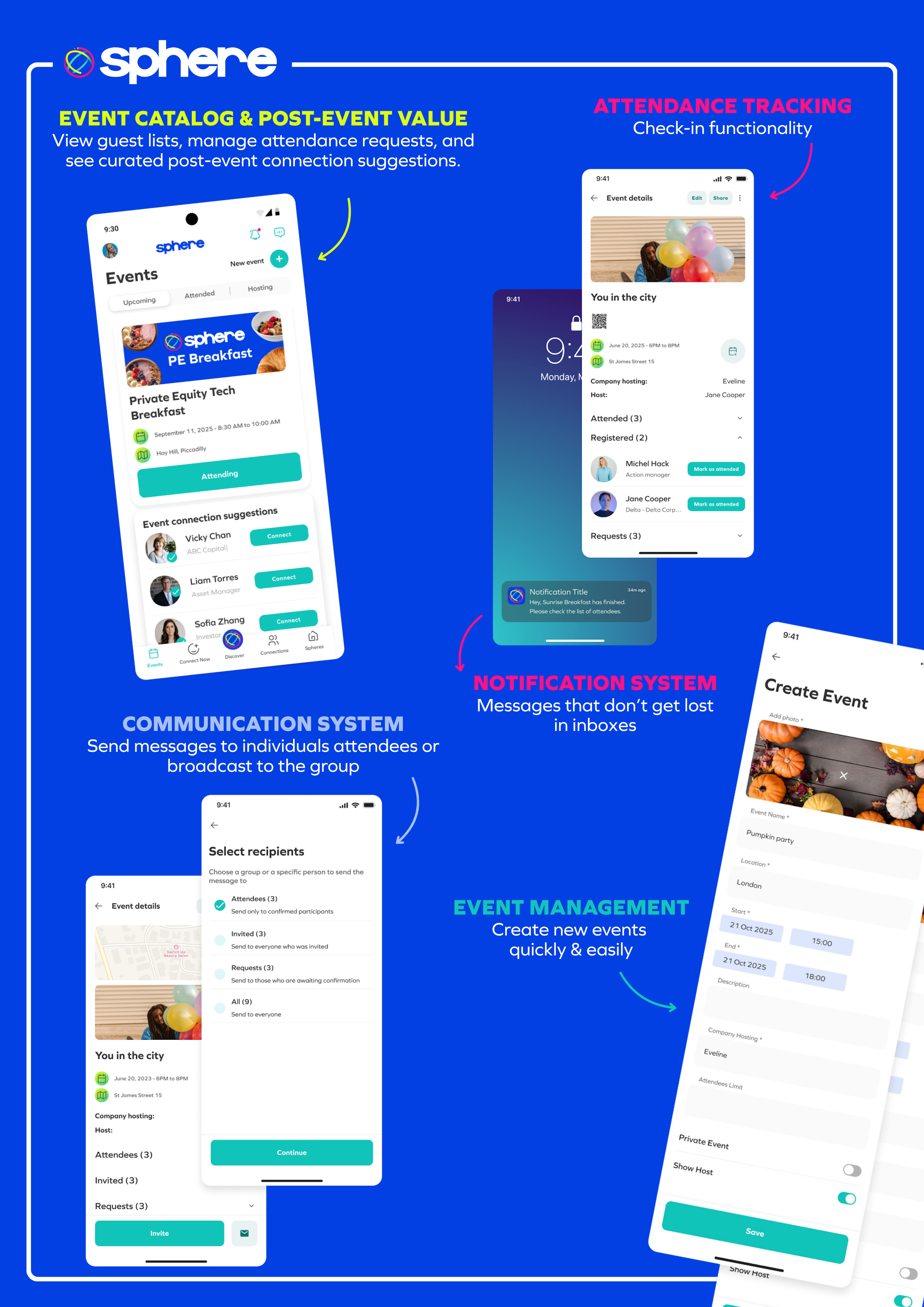 Sphere is a networking and business development platform designed for professionals in financial services. The software aims to modernise how professionals connect, replacing outdated networking methods with a more structured and efficient approach.